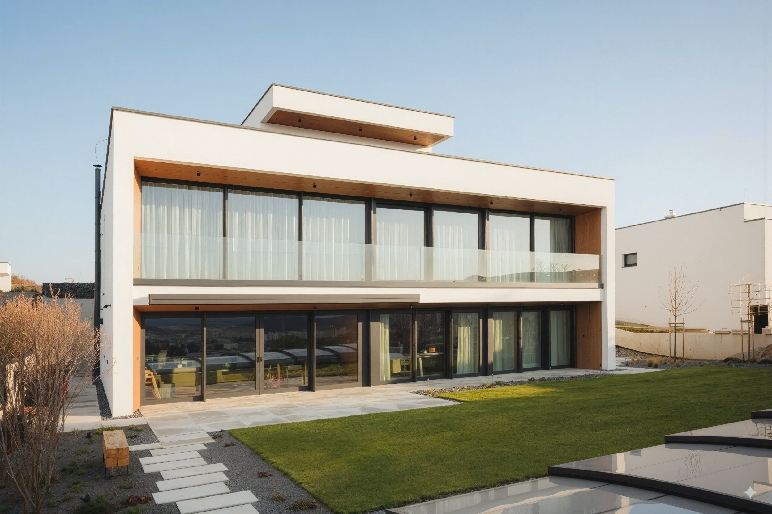 Základom stavby je betónová konštrukcia, ktorá určuje rytmus celého priestoru. Interiér je orientovaný smerom do záhrady, kde sa fasáda plynulo mení na celopresklenú stenu. Tá poskytuje nerušený výhľad, prepúšťa prirodzené svetlo a vytvára harmonické prepojenie medzi interiérom a exteriérom. Prírodné drevo v interiéri zjemňuje strohosť betónu a vnáša do priestoru teplo a útulnosť. Výrazným prvkom sú aj drevohliníkové okná MINTAL, ktoré zohrávajú dôležitú rolu nielen z hľadiska estetiky, ale aj v rámci technického riešenia celej stavby. Rozsiahle presklené plochy si vyžadujú mimoriadnu presnosť a pevnosť. Použitý bol kombinovaný systém rámov, kde vnútorný drevený profil zabezpečuje stabilitu a výborné mechanické vlastnosti, zatiaľ čo vonkajší hliník chráni pred nepriaznivými vplyvmi počasia a UV žiarením. Táto kombinácia umožňuje realizáciu veľkoformátových riešení bez potreby dodatočných výstuží, pričom si zachováva dlhodobú tvarovú stálosť, minimálne nároky na údržbu a vysokú životnosť.